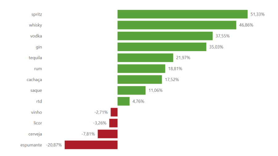 Chama a atenção também um crescimento expressivo no spritz (+51,33%), bebida a base de espumante, que provavelmente se tornou também um substituto para os drinks feitos com destilados. Veja no gráfico: