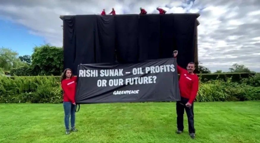 Ativistas do Greenpeace cobrem mansão particular do primeiro-ministro britânico com pano preto
